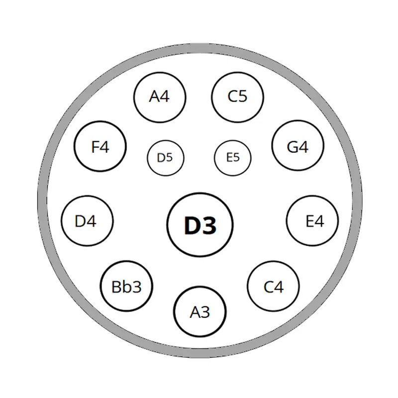 The D-Kurd is undoubtedly the most classic handpan scale at present. It boasts rich harmonies and a complete scale structure. The arrangement and layout of this scale are highly suitable for playing, making it very easy to get started with both rhythmic improvisation and melodic performance.
